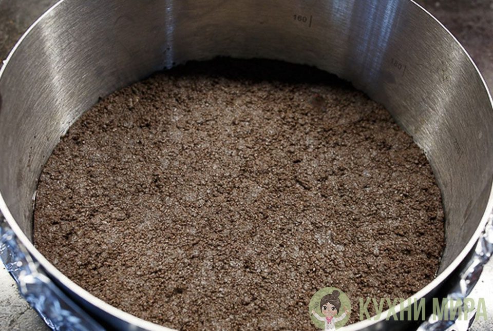 2 Сделано | Основа из печенья.Орео разделяем на половинки и убираем прослойку. У вас должно получиться 150 г печенья. Кладем печенье в комбайн и размалываем в крошку. То же самое можно проделать, сложив печенье в плотный пакет и прокатав скалкой. Масло растапливаем и вливаем в крошку. Перемешиваем. Выкладываем массу и утрамбовываем по дну разъемной формы. Ставим в разогретую до 170 градусов духовку и печем 10 минут. Вынимаем и остужаем. Температуру убавляем до 150 градусов. |
